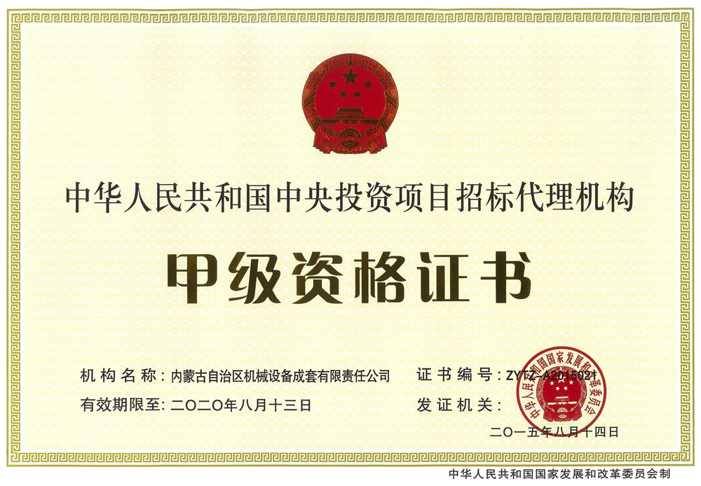 中央投資項(xiàng)目招標(biāo)代理機(jī)構(gòu)甲級資格證書